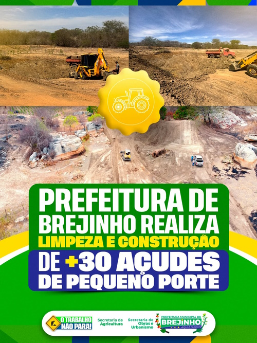 Com o olhar voltado para o homem e a mulher do campo, a Prefeitura de Brejinho deu início a um importante cronograma de infraestrutura rural. Por meio de uma parceria entre a Secretaria de Agricultura e a Secretaria de Obras e Urbanismo, o município está realizando a limpeza, recuperação e construção de mais de 30 açudes de pequeno porte.
