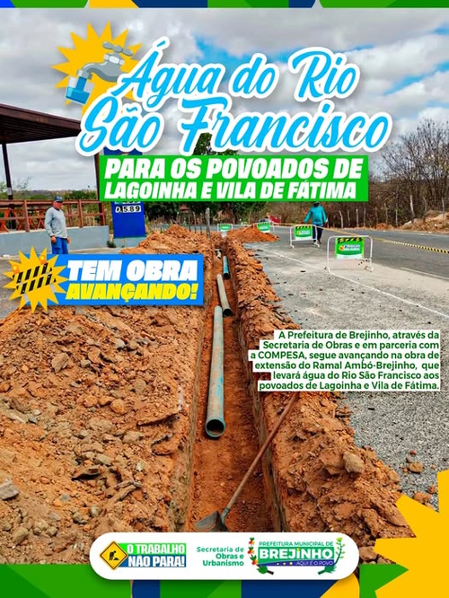A Prefeitura Municipal de Brejinho segue avançando na obra de extensão do Ramal Ambó-Brejinho, que levará água do Rio São Francisco aos povoados de Lagoinha e Vila de Fátima. A ação está sendo executada por meio da Secretaria de Obras e Urbanismo, em parceria com a COMPESA, e representa um importante passo para a ampliação